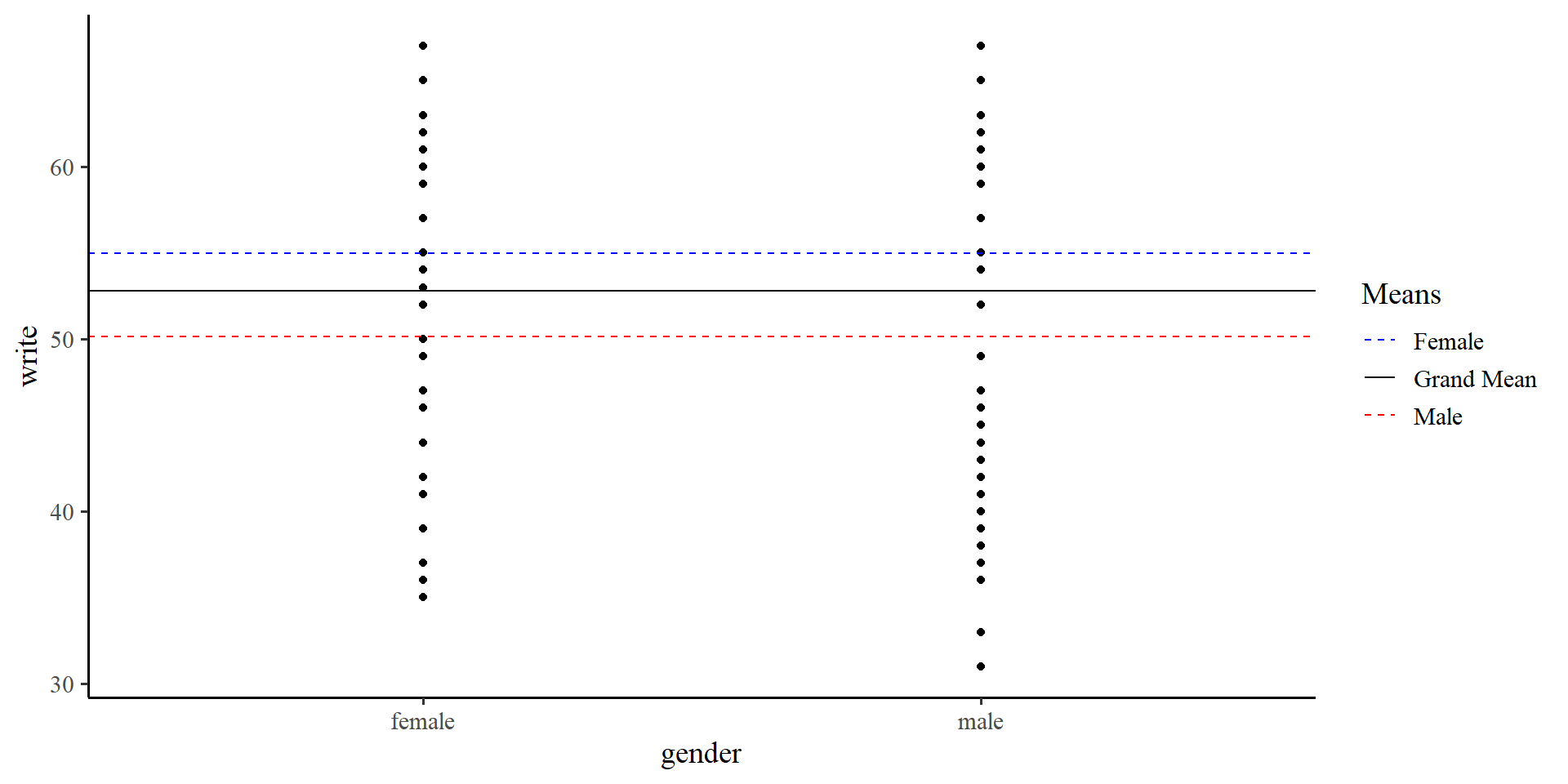 write, should differ based on gender.In the previous plot we were using the “grand mean” of write. If we use the two means instead…