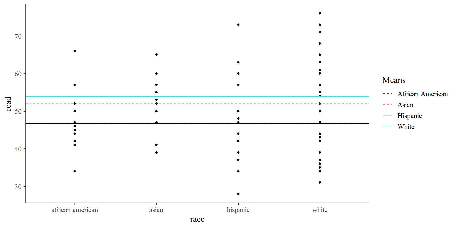 lm(formula = read ~ `race_african american` + race_asian + race_hispanic,