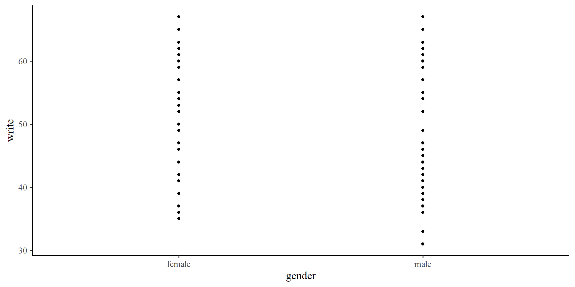 write score on the \(y\)-axis and gender on the \(x\)-axis we can visualize observations in each group. But there are no “units” on the \(x\)-axis 🤔