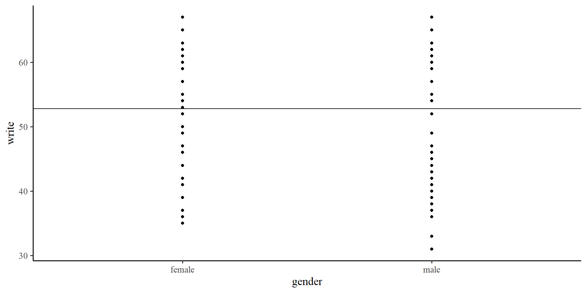 ggplot(hsb2, aes(x = gender, y = write)) +